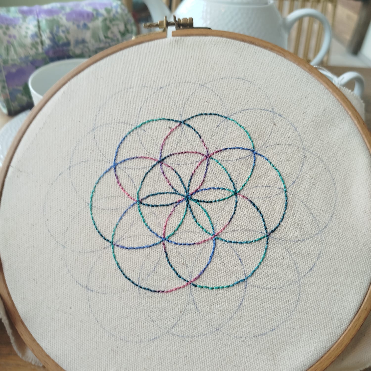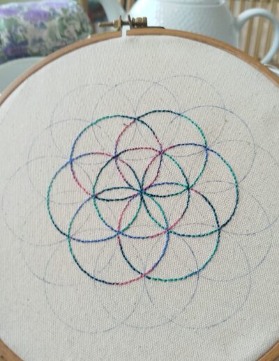 Un atelier qui mêle spiritualité, symboles et broderie contemporaine. Lors de cet atelier, tu découvriras ce qu’est la géométrie sacrée : un art ancestral qui révèle l’harmonie cachée du vivant à travers des formes simples et puissantes. Tu apprendras à dessiner la fleur de vie et à en comprendre la symbolique et les mystères qu’elle contient : une plongée fascinante dans l’histoire de la création. Puis, place à la broderie : découverte du matériel, initiation aux points de base, reproduction du dessin sur tissu… Tu commenceras à broder ta propre fleur de vie lors de ce
